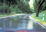 20 .- Cuando la calzada está mojada, ¿qué zona es especialmente resbaladiza?