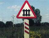 B) A la derecha de la calzada, la proximidad de un paso a nivel provisto de barreras o semibarreras.