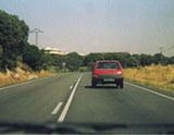 4 .- Ud. conduce su turismo por esta calzada. A la vista de la señalización que se observa en la fotografía, ¿le está permitido adelantar al turismo rojo?.