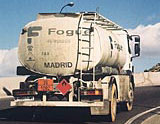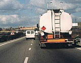 25 .- Cuando Ud. se prepare para adelantar al camión cisterna que se observa en la fotografía, de acuerdo con las señales que el mismo lleva, tendrá que tener en cuenta que es un vehículo que...