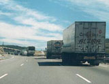 2 .- En esta vía fuera de poblado de tres carriles reservados al sentido de su marcha, Ud. se dispone a adelantar a los tres camiones que se observan en la fotografía. ¿Es correcto su comportamiento?.
